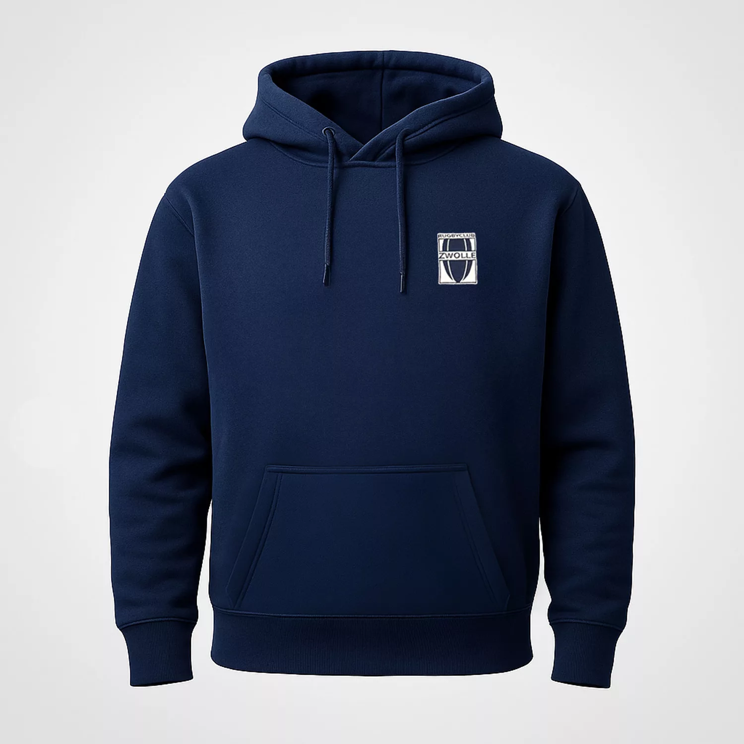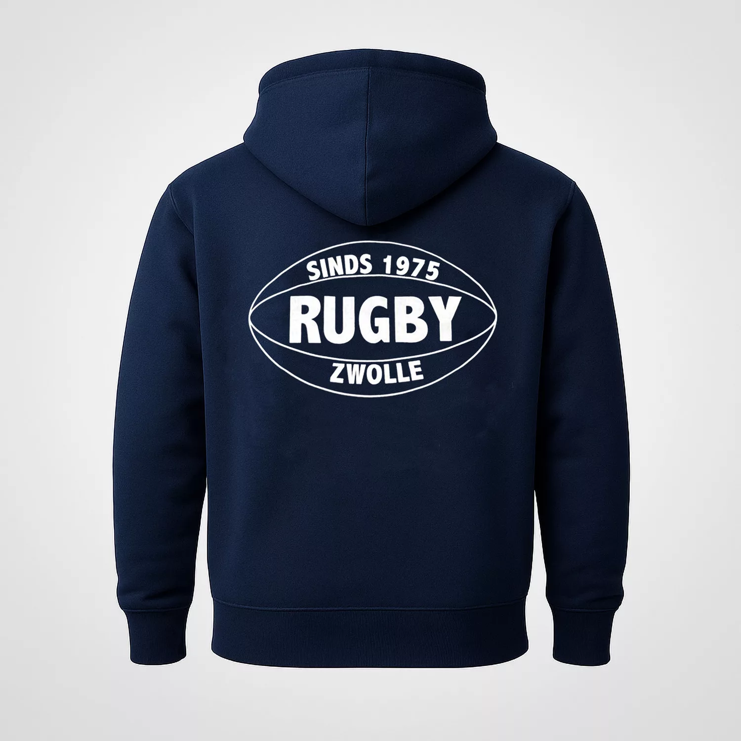 Rugby hoodie met het logo van Rugbyclub Zwolle en op de rug ‘SINDS 1975 – RUGBY – ZWOLLE’